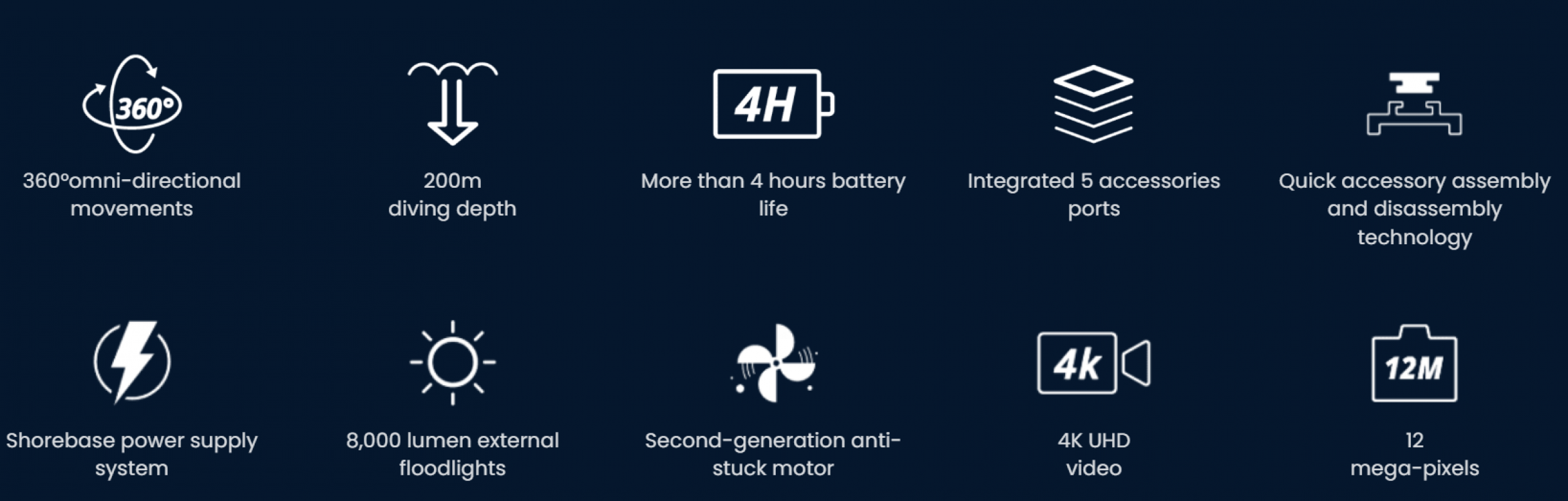 Dronă subacvatică ROV heavy-duty, de nivel industrial, concepută pentru intervenții rapide și lucrări profesionale în medii subacvatice dificile.